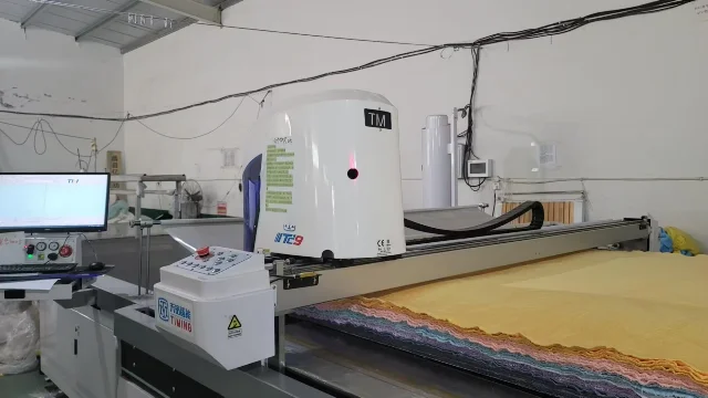 This is an automated cutting machine. Compared to manual cutting, the automated machine ensures more precise towel dimensions and higher efficiency.