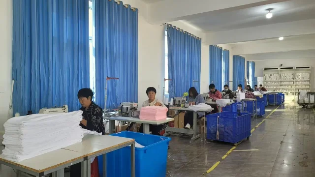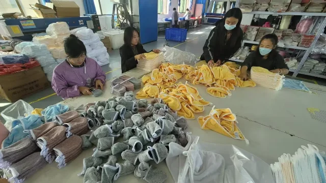 Workers will first inspect the towels, then trim off any loose threads, and finally package them.